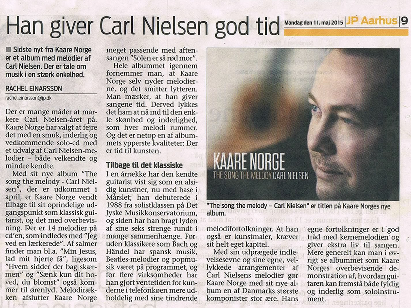 Kaare Norges arrangementer forholder sig respektfuldt og ydmygt til Carl Nielsens originale forlæg. Carl Nielsen skrev mig bekendt aldrig musik for guitar, men faktisk demonstrerer Kaare Norge, at guitaren på sin lavmælte og ikke anmassende facon er med til at understrege storheden i Carl Nielsens kompositionskunst. Den viser,hvilken betagende indre styrke , der ligger i Carl Nielsens melodier - nemlig en sprød enkelhed, der samtidig gemmer på en ukuelig vilje til liv.